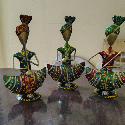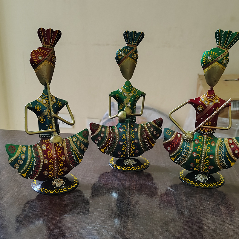 Enhance your space with the Sitting Sardar set of 3. This handpainted Rajasthani art metal piece, with its vintage look, is ideal for both office and home decor.