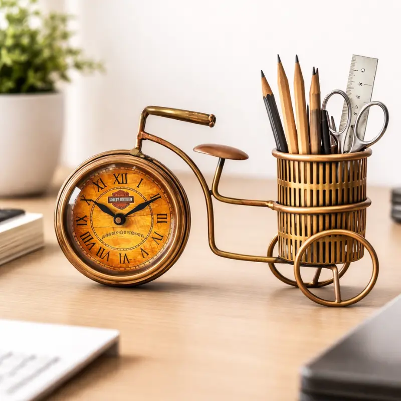 Made from high-quality durable metal with an antique finish, this decorative cycle pen holder also features a built-in analog clock, combining style, utility, and organization. Its artistic handcrafted design makes it ideal for vintage décor lovers, professionals, and gift buyers.