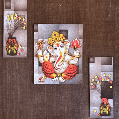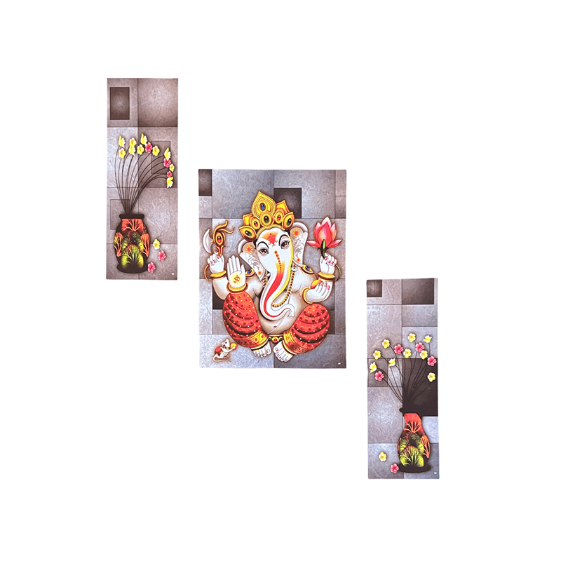 This Ganesh Ji Wall Painting Set (Set of 3) is a perfect décor piece to bring positivity and peace to your home or office. This set includes an attractive HD print frame of Lord Ganesha in the center and beautiful flower vase design frames on both sides, giving your walls a modern and spiritual look.