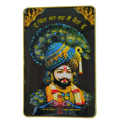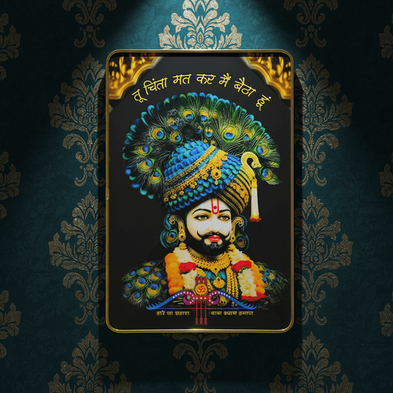 This high-definition print features Khatu Shyam Ji adorned with vibrant peacock feathers and the comforting message “Do Chinta Mat Kar, Main Baitha Hoon”, reminding devotees to surrender their worries in faith.