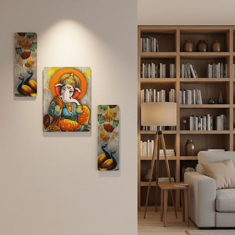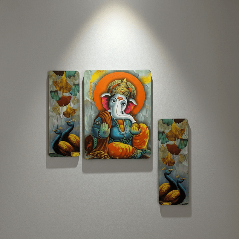 Set of 3 Ganesh Ji Wall Photo Frames with peacock design. Premium HD print, perfect for home, office, living room & gifting. Beautiful spiritual wall decor.