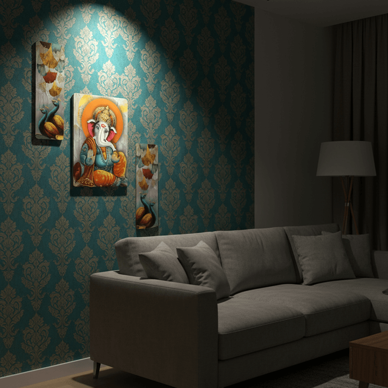 This Ganesh Ji Wall Painting Set (Set of 3) is the perfect décor piece to add positivity and beauty to your home or office. This set includes an attractive center HD print frame of Lord Ganesha and beautiful peacock design frames on either side, giving your walls a royal and spiritual touch.