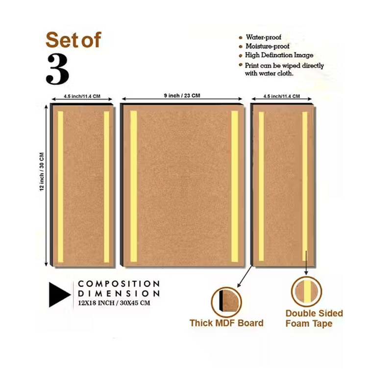 The frames are made of high-quality laminated HD print, which keeps the colors vibrant for a long time. The lightweight material makes them easy to apply on any wall—be it a living room, bedroom, temple, office, or hallway.